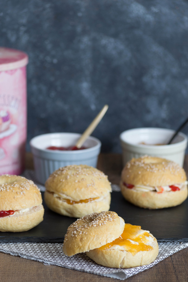 La receta de esta semana son unos deliciosos bagels. Son unos panes con un agujero en medio que tienen una forma peculiar de cocerse. Para ello cuando la masa está lista se ponen en agua hirviendo  con bicarbonato y después se termina de cocer en el horno; de esta forma conseguimos unos bagels esponjosos por dentro y con una capa crujiente por fuera.