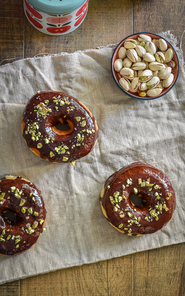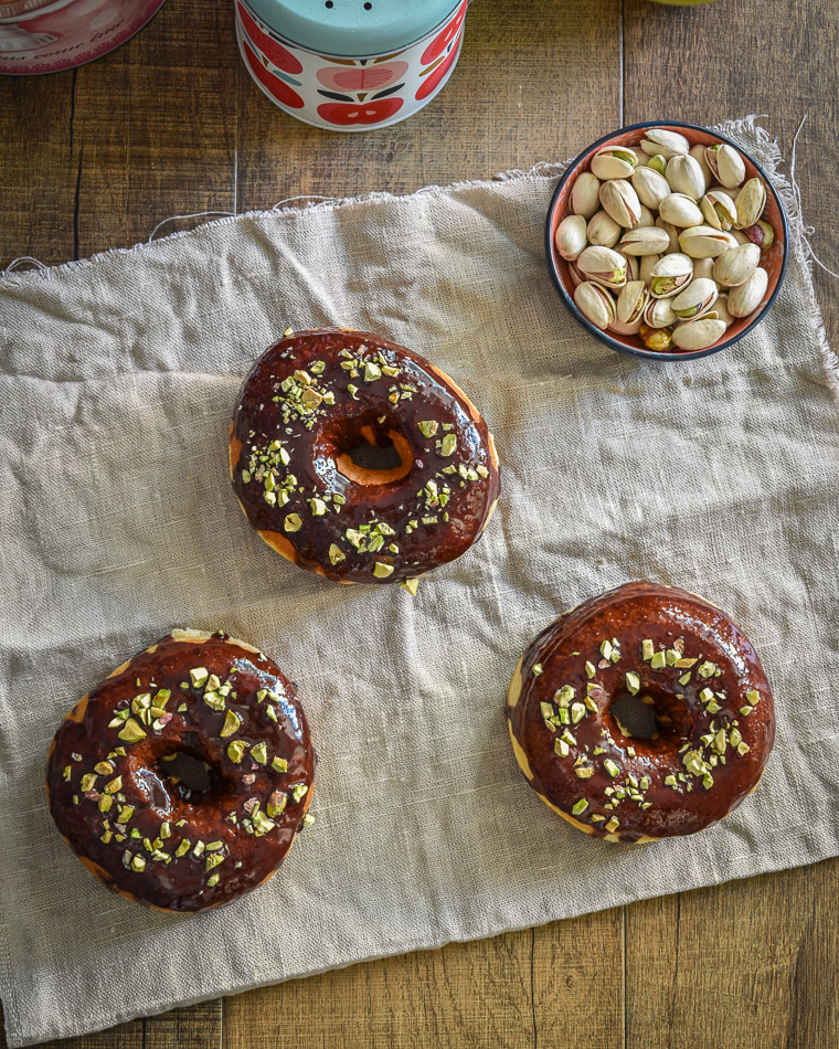 - Introducimos una banda del donut en el glaseado y le añadimos los pistachos troceados. Dejamos sobre una rejilla hasta que se sequen.