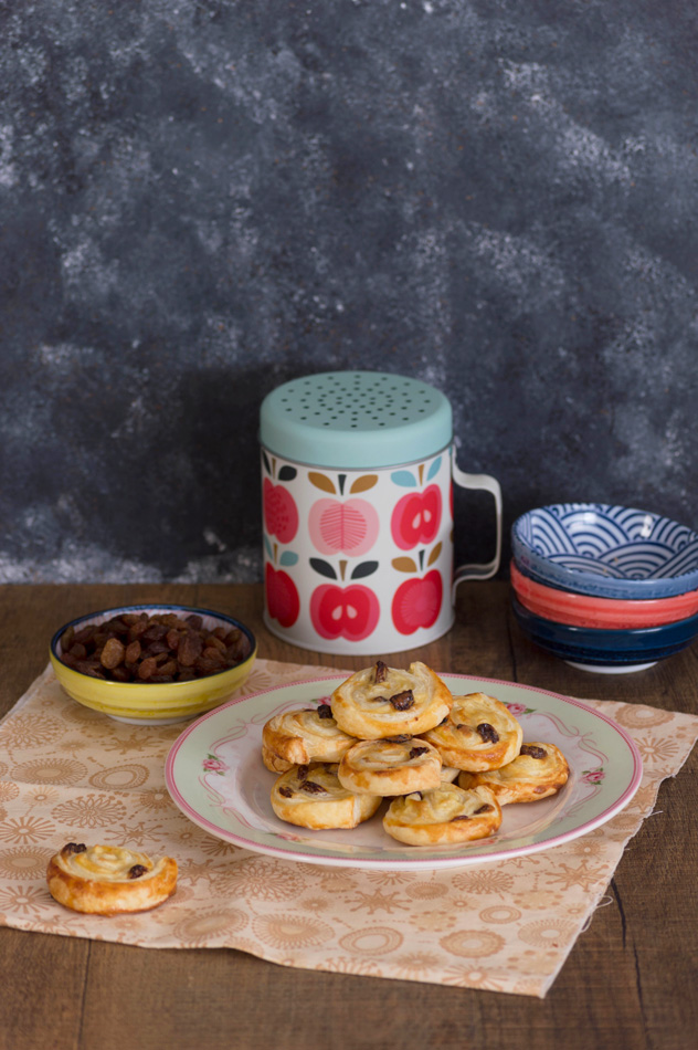 Espirales de hojaldre, crema y pasas