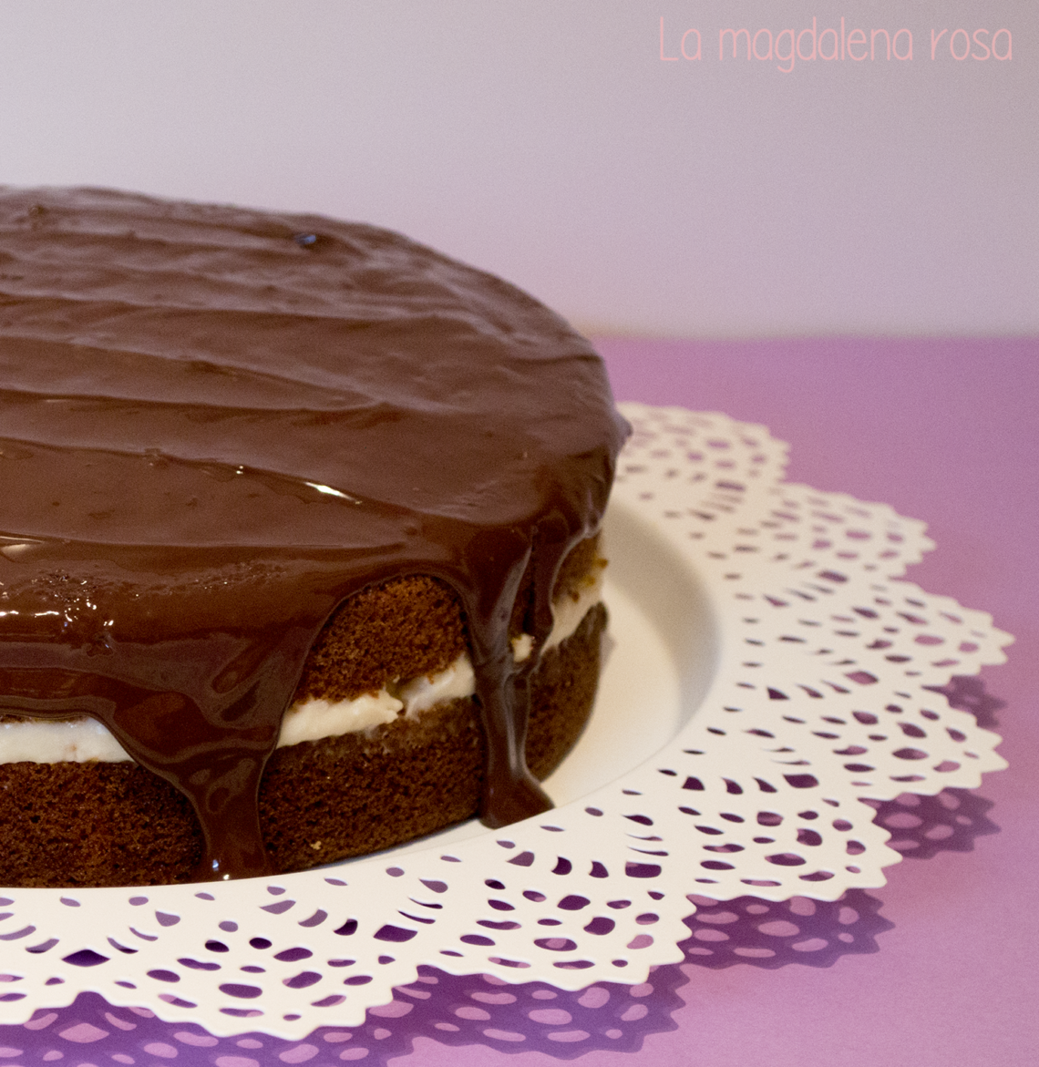 Y ya tenemos nuestra tarta «Boston Cream» lista. Como podéis comprobar es muy sencilla y rápida de hacer y montar. Yo le añadí el almíbar porque aunque este bizcocho es muy esponjoso me gusta que las tartas queden más melosas.