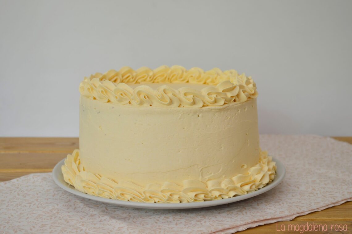 Como quería que quedase ligera y fresca me decanté por el swiss meringue buttercream. He de decir que últimamente es el relleno que más uso ya que su sabor me parece riquísimo y muy ligero sobretodo para el verano.
