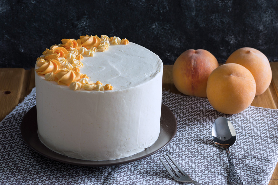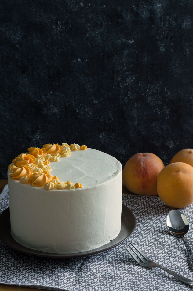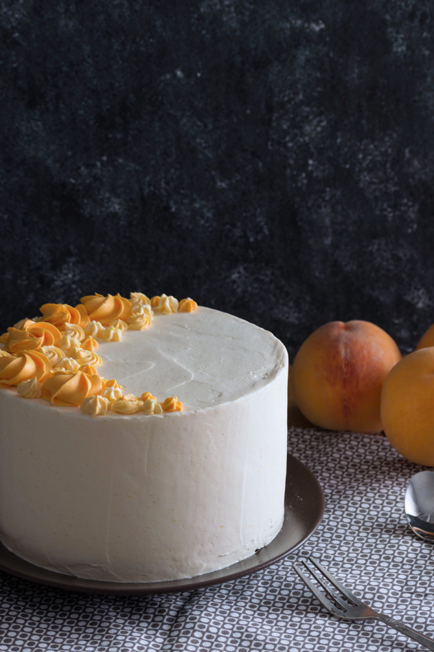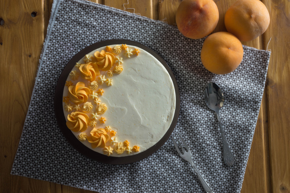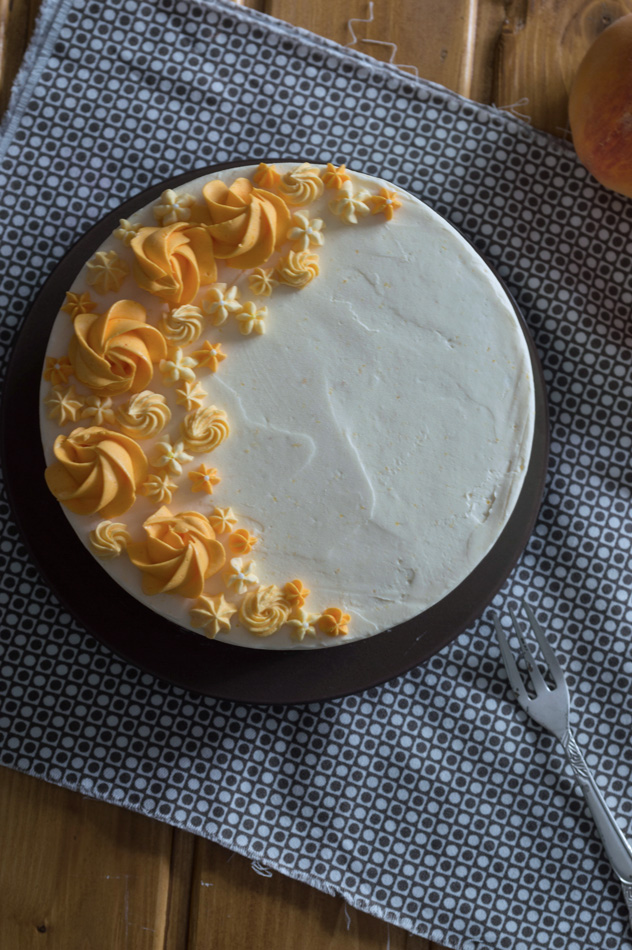 - Ponemos un capa de bizcocho; ponemos una capa fina del swiss meringue buttercream de melocotón y con la ayuda de una manga pastelera y una boquilla redonda hacemos un círculo al borde, para poder poner los melocotones y que no se salgan.