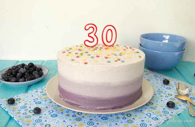 Así que me decanté por un bizcocho de vainilla con un swiss merengue buttercream de vainilla también relleno de mascarpone con arándanos. Par la decoración quería algo sencillo pero vistoso así que opté por un degradado del swiss merengue buttercream en tres tonos de lila.