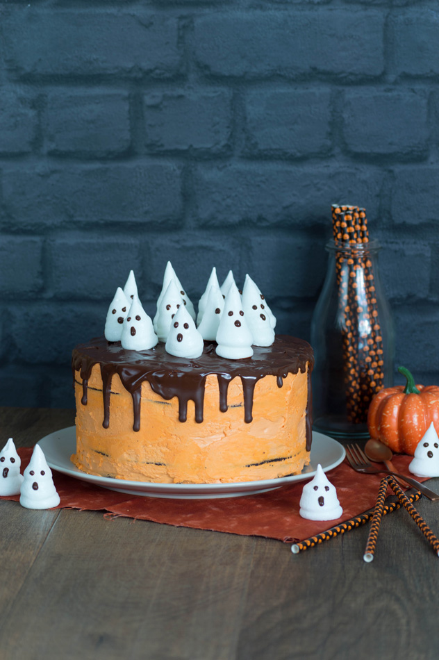Había visto unas tartas con fantasmas hechos con merengue y me resultaron muy graciosas así que decidí preparar una con esa decoración. Como en casa son bastante chocolateadictos y mi madre no puede tomar fruta por una intolerancia y nos íbamos a reunir toda la familia; decidí hacer el bizcocho de chocolate y el swiss meringue buttercream de vainilla.